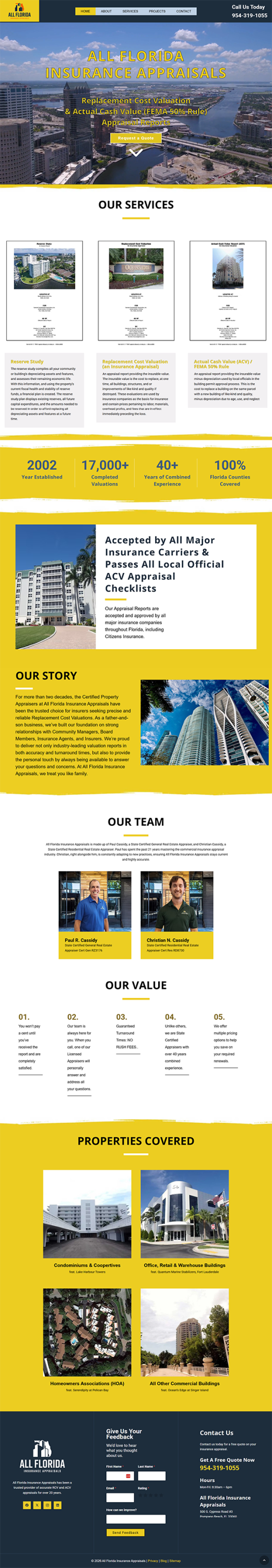 WW Web Design Studios delivered a complete appraiser website design for All Florida Insurance Appraisals, combining modern aesthetics with performance-driven functionality. The project included a full re-branding, a custom-built website, and localized SEO strategies to target multiple service areas. With optimized user experience, clear service messaging, and strong call-to-actions, the site was designed to generate qualified leads while strengthening the company’s digital presence across search engines and social platforms.