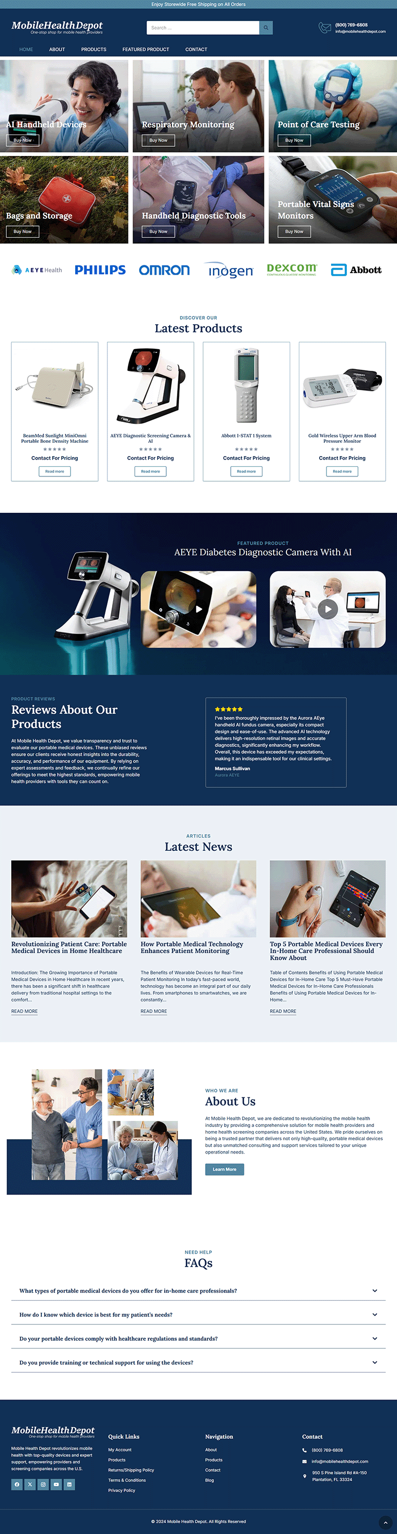 This medical device website design for Mobile Health Depot was built to deliver a seamless, trustworthy, and conversion-driven digital experience tailored to the healthcare and medical supply industry. WW Web Design Studios executed a full redesign, starting with a refined brand identity and custom logo design that reflects professionalism, precision, and reliability—key attributes in the medical device market.